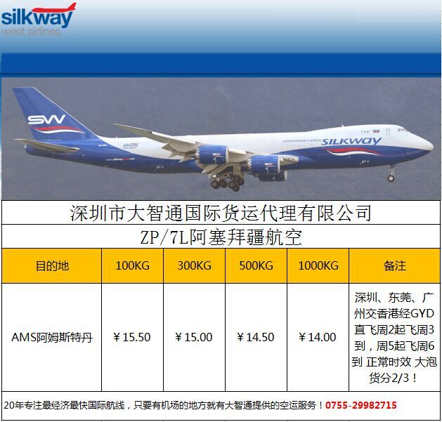HKG-ZP阿塞拜疆航空到阿姆斯特丹最新优惠价,深圳大智通第一时间了解国际空运价格行情,让您不必亏在运费上。订舱热线:400-0755-028