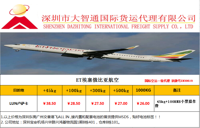 香港直飞,ET埃塞俄比亚最新空运价格,卢萨卡空运专线是我们深圳大智通国际货运公司新推出的国际空运航线之一,由于是空运专线服务,所以就有优势,卢萨卡空运价格方面也就非常实惠,吨价可以低到26.0元每公斤以下,每天都有航班直飞,走ET(埃塞俄比亚航空公司)欢迎广大新老顾客朋友咨询本公司关于卢萨卡空运专线的详情