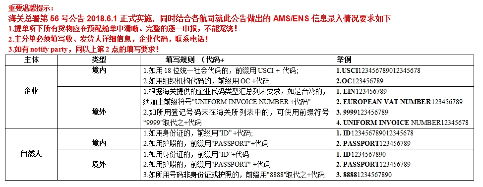2、收发货人、通知人代码按照《企业代码类型汇总表》(见公告附件40)进行填写,填写格式为“代码缩写+企业代码”,例如:境内具有统一社会信用代码的企业,应填写“USCI+代码”,暂无统一社会信用代码的,则填写组织机构代码“OC+代码”。