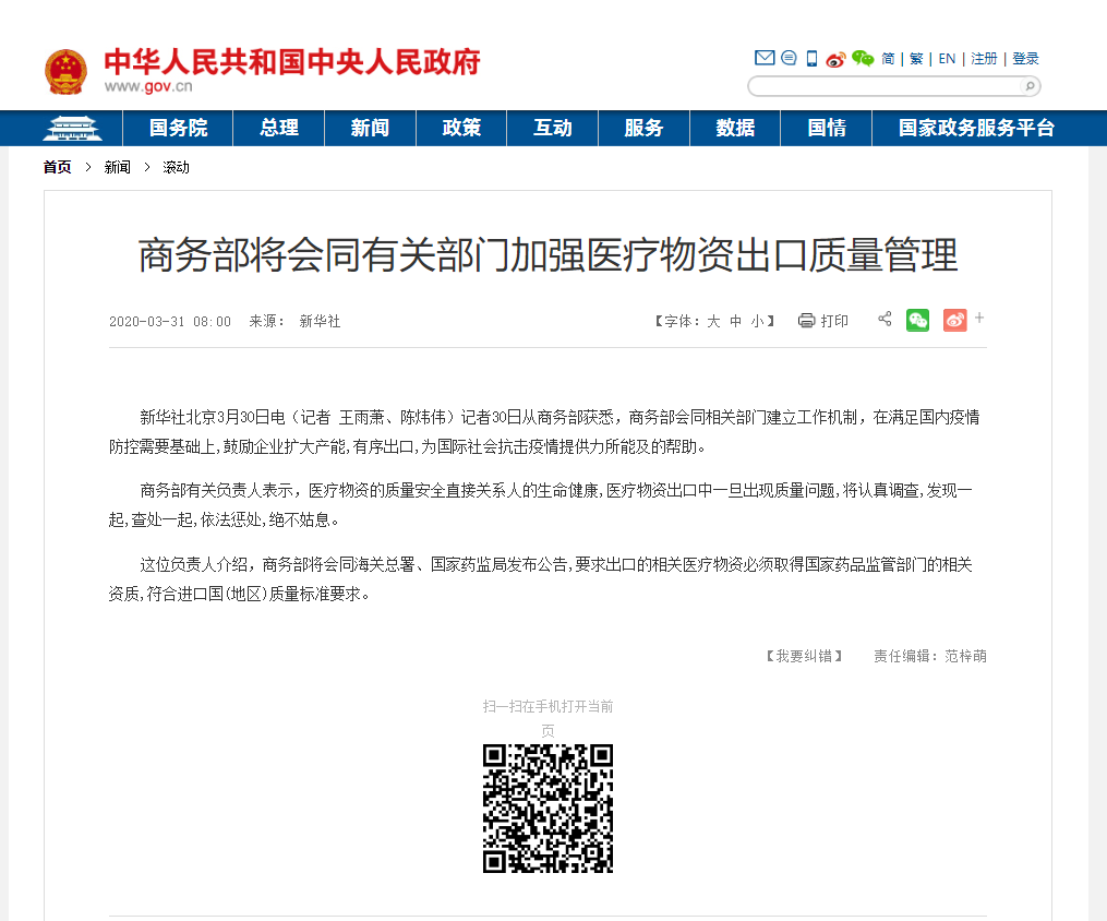 政策解读:国家讲了首先要鼓励企业扩大产能,有序出口,为国际社会贡献力量。同时要求出口相关医疗物资必须取得国家药品监管部门的相关资质,符合进口国(地区)质量标准要求。如果出现质量问题,将认真调查,发现一起,查处一起,依法严惩。