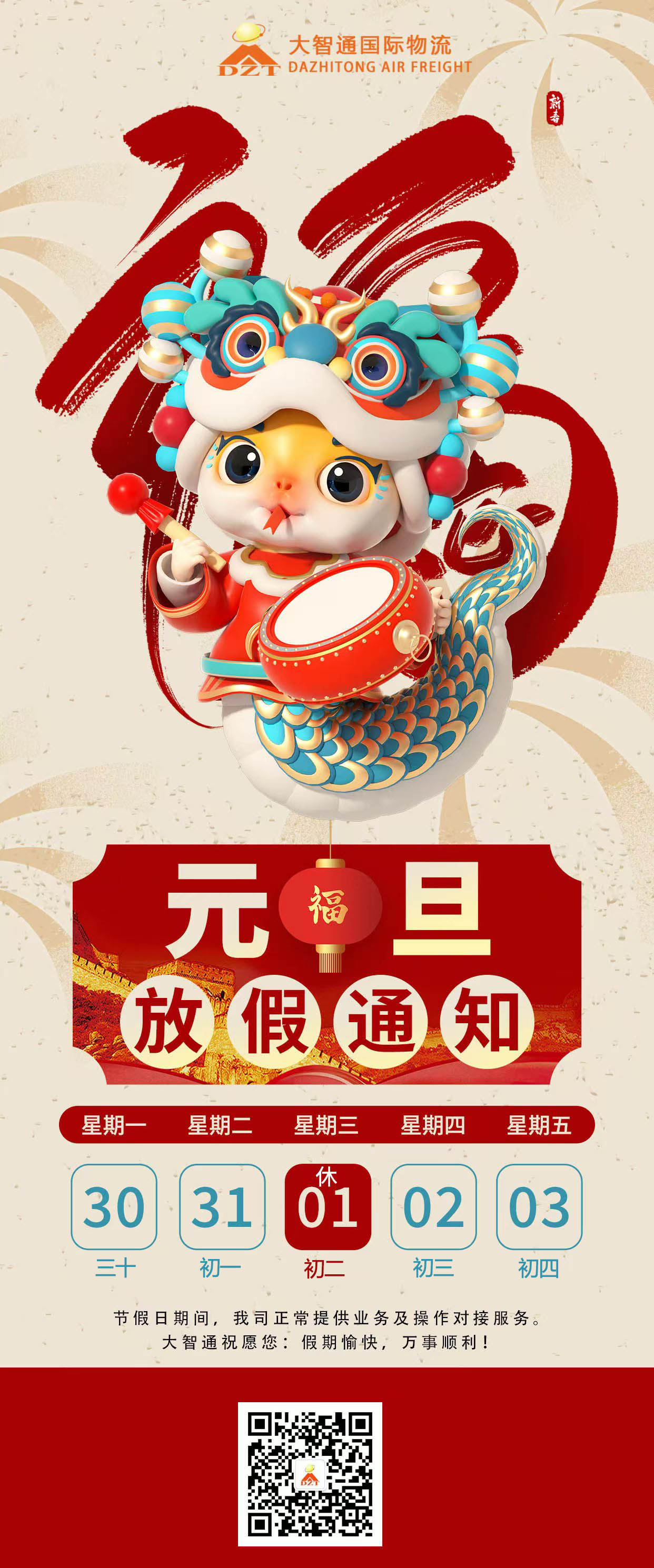 您好!喜迎新年,感谢贵司在2024年给予我们的鼎力支持。在新年来临之际,深圳市大智通国际货运代理有限公司全体员工祝您和您的家阖家欢乐,万事如意!根据国务院相关规定,结合我司实际情况,现将我司2025年元旦节放假具体安排如下: