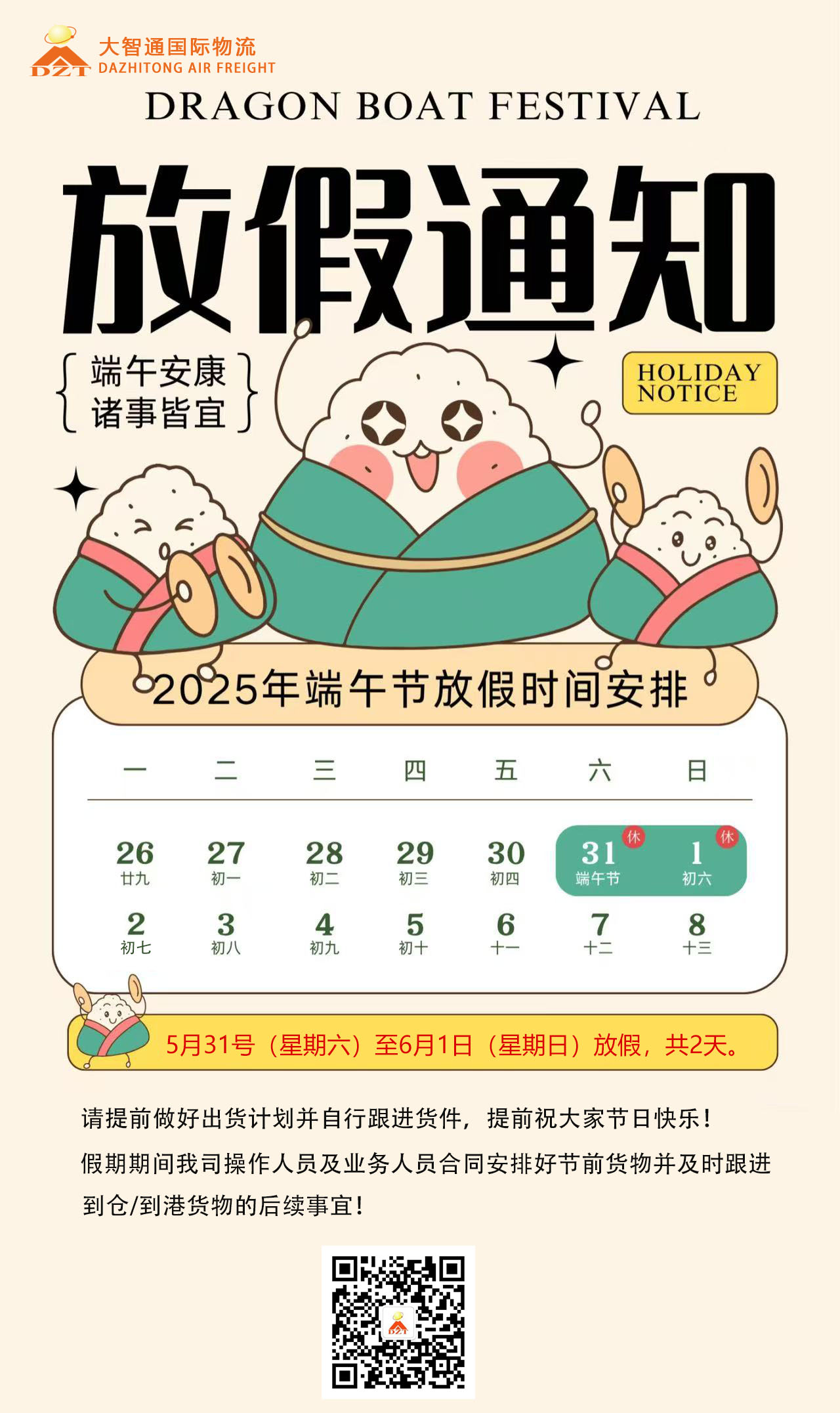 感谢各位长期以来对我司的信任与支持。端午节将至,现结合我司实际业务情况,我们特此通知您,2025年端午节假期时间安排如下:端午节放假时间为5月31日(星期六)至6月1日(星期日)共计2天,6月2日正常上班