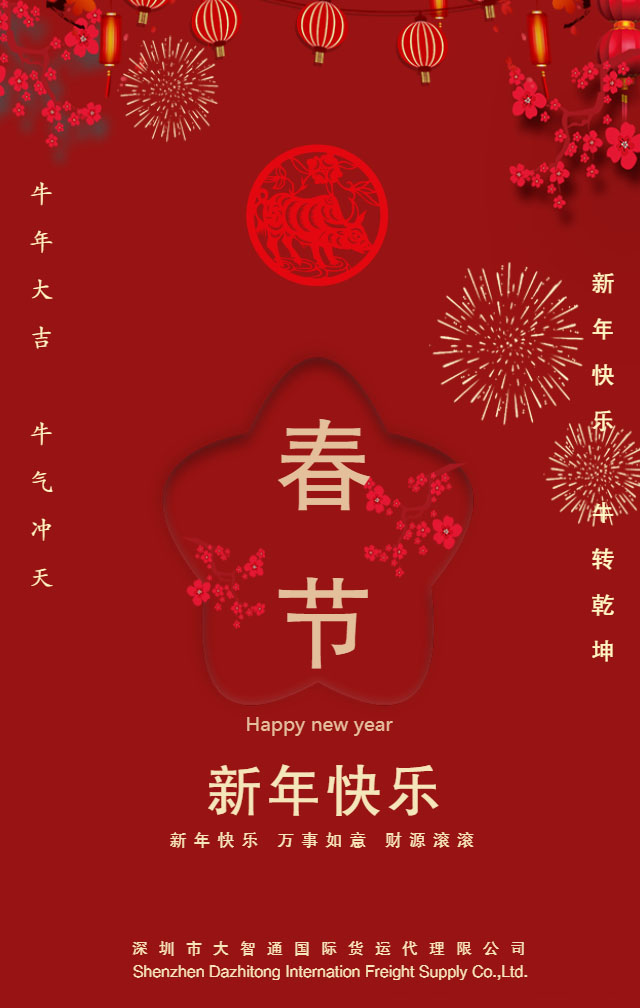 尊敬的客户:喜迎新春,万象更新,深圳市大智通国际货运代理有限公司全体员工在此感谢您长期以来对我们的支持与厚爱!在新的一年里,我们会 ...