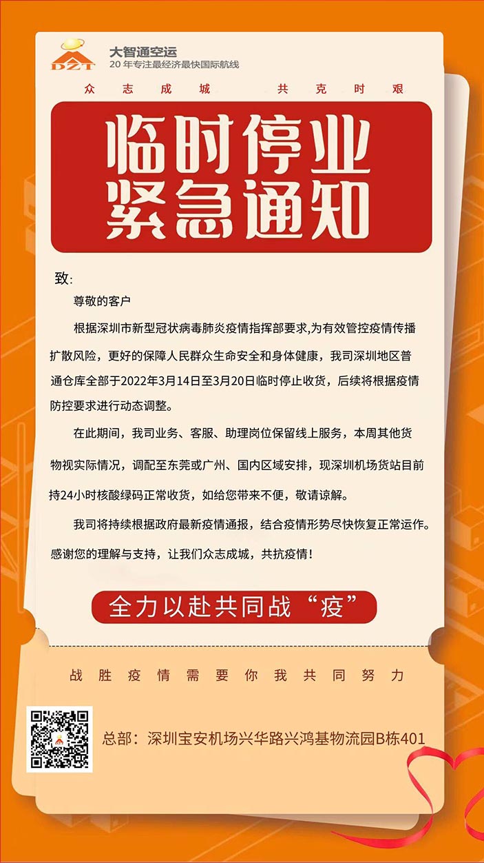 从3月14号开始所有员工居家办公,暂停收货、停止转运,已经入库深圳仓库的货物未操作的待场所恢复营业后操作。