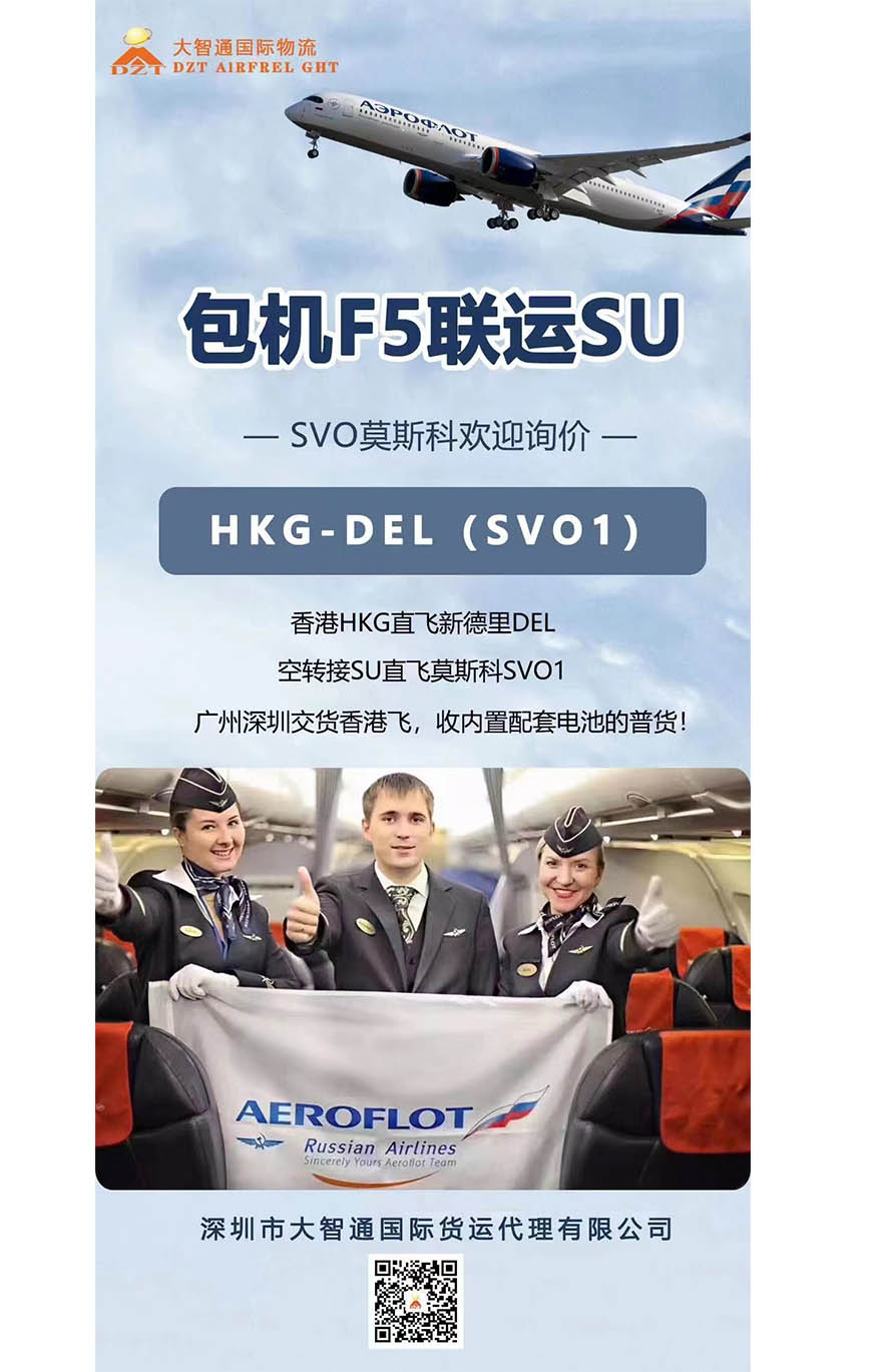 【包机F5联运SU】:香港HKG直飞新德里DEL,空转接SU直飞莫斯科SVO1