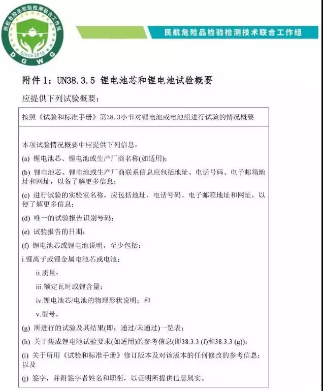 2019-2020版国际民航组织《危险物品安全航空运输技术细则》规定, 2003年6月30日以后生产的锂电池芯或锂电池的制造商和随后的销售商必须提供联合国《试验和标准手册》第三部分第38.3 小节第38.3.5 段规定的试验概要(以下简称UN38.3试验概要)。这种UN38.3试验概要必须自2020 年1 月1 日起提供。